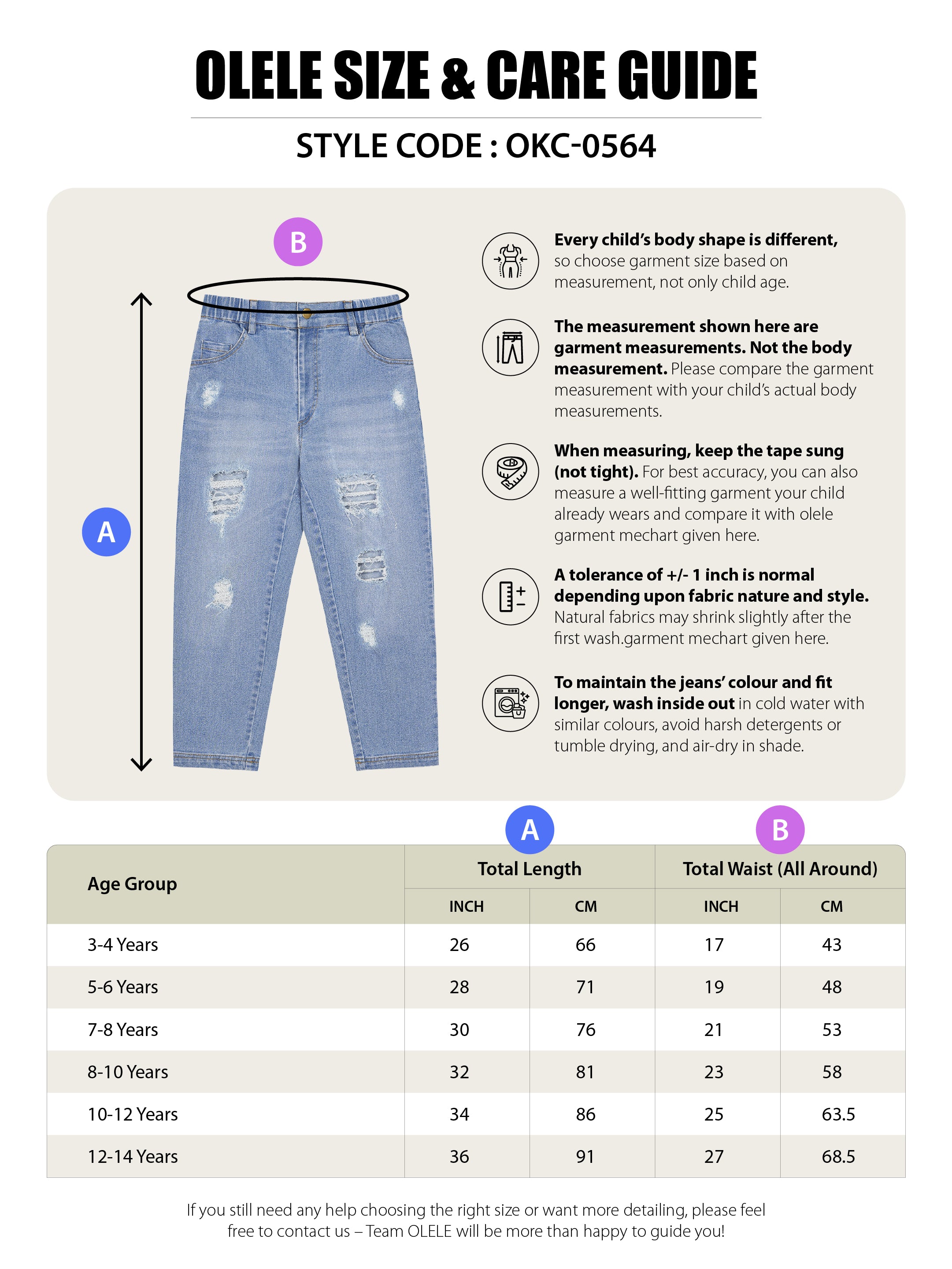 The Olele® Girls Regular Fit Stretchable Distressed Wash Vanilla Jeans Pant is a thoughtfully handcrafted piece tailored for kids aged 4 to 14 years. Made from premium cotton denim, these jeans combine stretchability and comfort, making them an ideal choice for daily wear. Designed to provide a snug yet flexible fit, they ensure kids can move freely and comfortably throughout their day, whether at school, playtime, or family outings.
