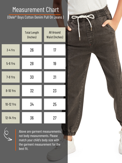 Let your little one rock a cool, confident look with the Olele® boys denim jeans pant in classic black, designed for boys aged 4 to 14 years. Made from soft, breathable cotton-rich denim, these pull-on jeans come with an elasticated waist and bottom hem for a snug, comfy fit. The adjustable cotton drawstrings make it easy for kids to wear without any help—no buttons or zippers needed! Plus, the two handy side pockets are perfect for storing little treasures. Whether it’s for school, outings, or relaxed weekends, these boys denim jeans pant offer a perfect mix of style and comfort. The sleek black color pairs effortlessly with any top, from bright tees to smart shirts. Best of all, these jeans are crafted without harsh chemicals, making them safe for sensitive skin. Easy to wear, easy to care for—Olele® boys denim jeans pant is a must-have for every young boy’s wardrobe. Get him ready for all-day play with all-day style!